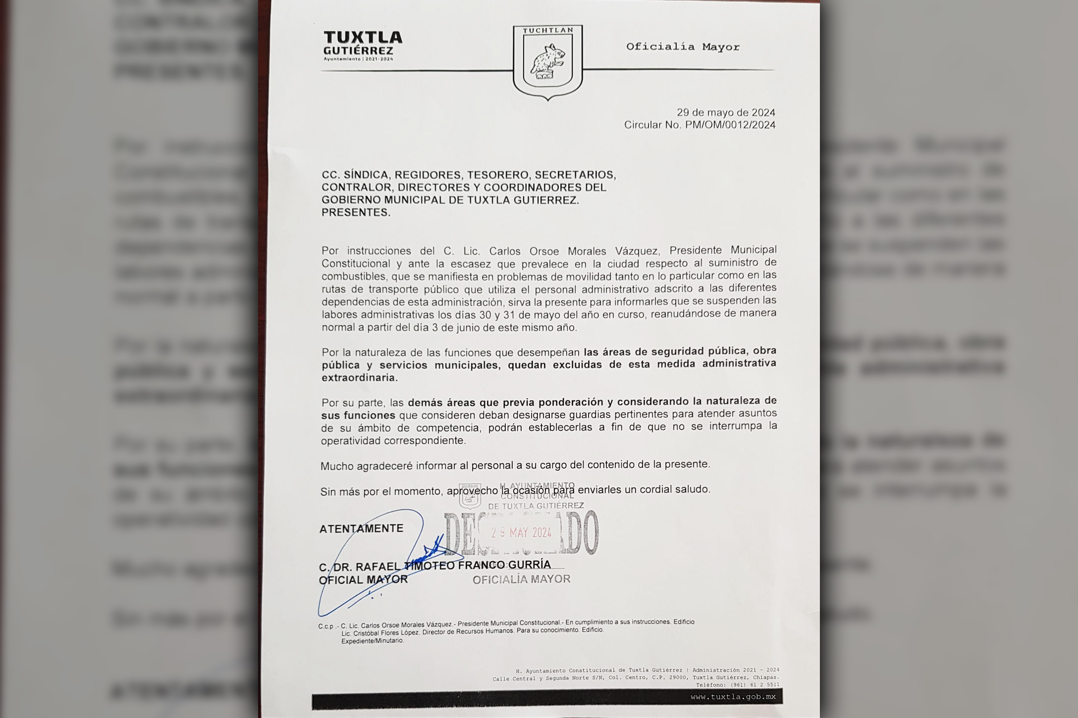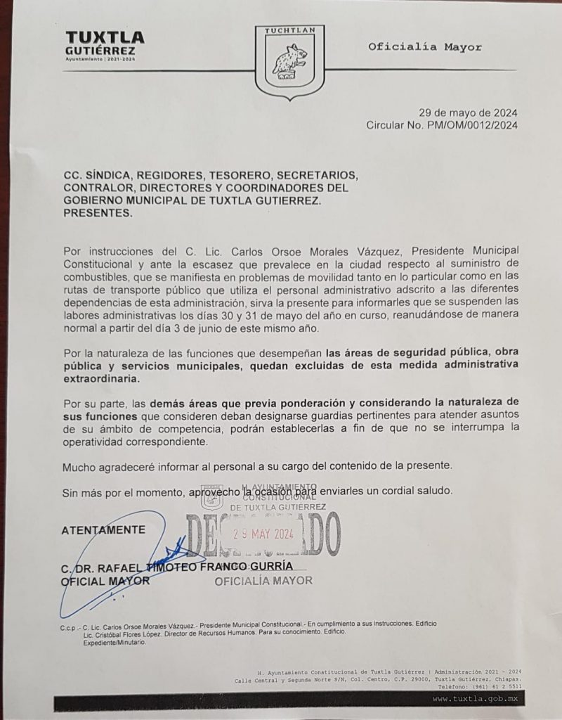 Tuxtla Gutiérrez.- Mediante un la circular PM/OM/0012/2024, el Ayuntamiento de la capital chiapaneca, informó que las actividades administrativas quedarían suspendidas los días 30 y 31 de mayo y que se reanudarán hasta el próximo lunes 03 de junio.