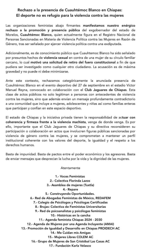 Tuxtla Gutiérrez.- Diversas colectivas feministas de Chiapas, manifestaron su rechazo ante la anunciada visita del diputado federal Cuauhtémoc Blanco Bravo, quien participará en un partido de fútbol en la capital chiapaneca, pese a que ha sido señalado públicamente como agresor y cuenta con una denuncia penal por violencia sexual.