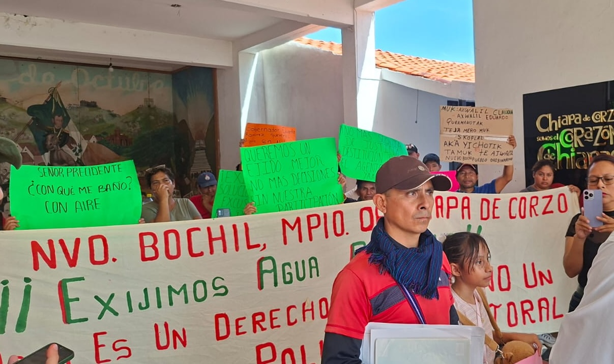 Los inconformes recordaron que Nuevo Bochil fue fundado en 1996 por familias desplazadas durante el conflicto armado de 1994 en Chiapas, y desde entonces no cuentan con acceso formal al agua potable.
