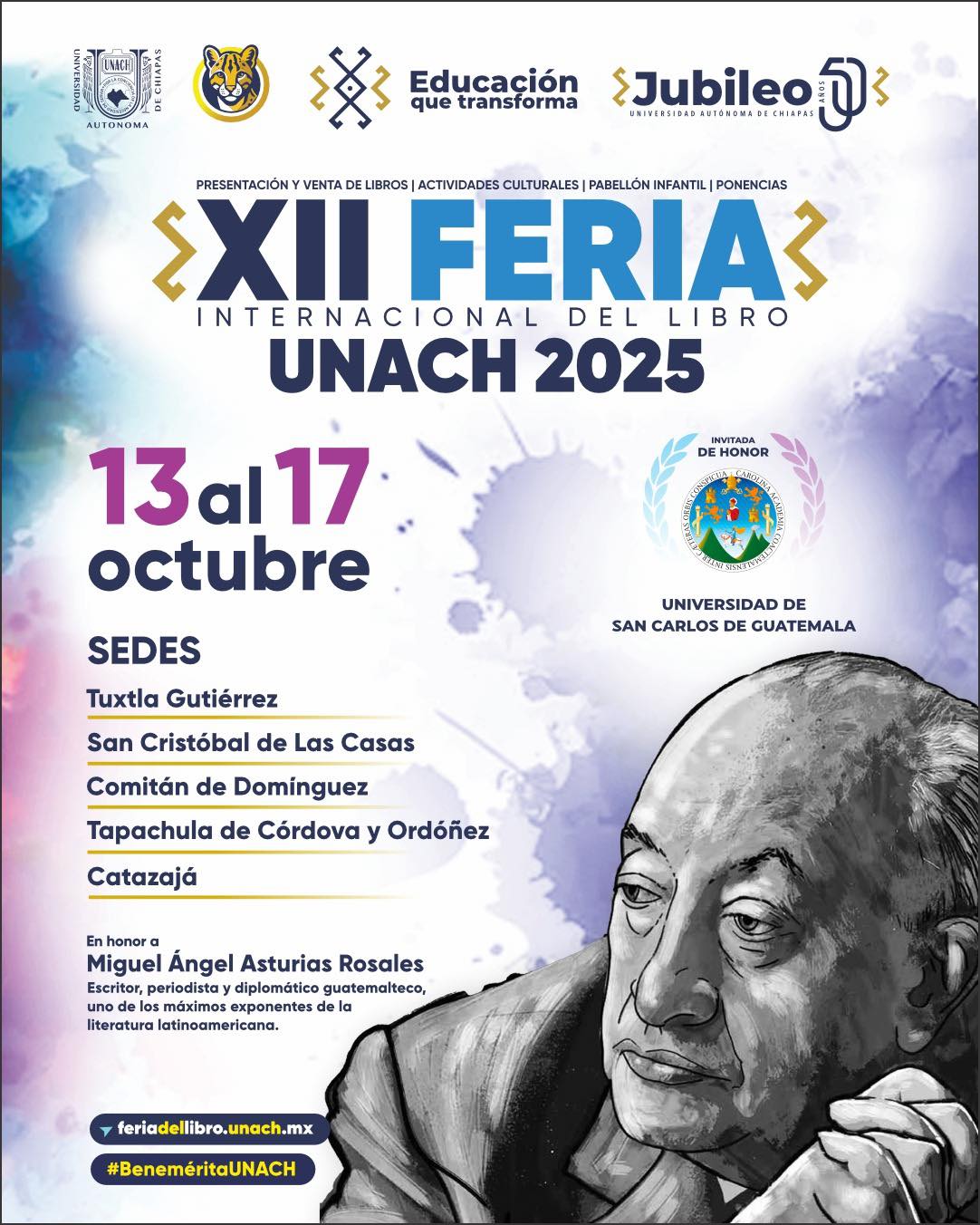 La Benemérita Universidad Autónoma de Chiapas (UNACH) realizará del 13 al 17 de octubre la XII Feria Internacional del Libro UNACH 2025, con sedes en las ciudades de Tuxtla Gutiérrez, San Cristóbal de las Casas, Comitán de Domínguez, Tapachula y Catazajá, informó el secretario académico, Flotentino Pérez Pérez.