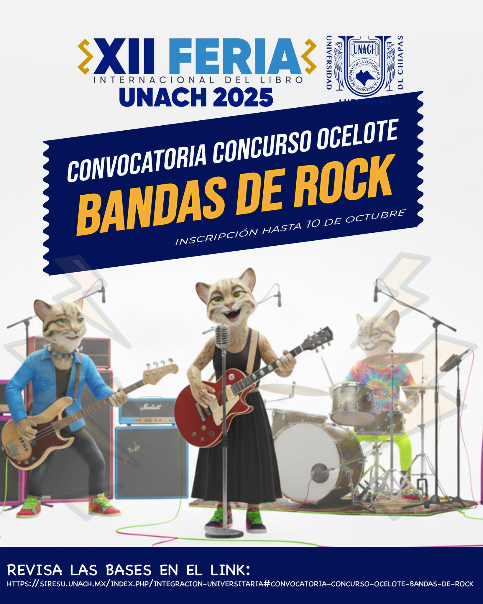 En el marco de la XII Feria Internacional del Libro UNACH 2025, la Universidad Autónoma de Chiapas lanzó la convocatoria para el primer Concurso Ocelote de Bandas de Rock, que se llevará a cabo el próximo 15 de octubre a las 17:00 horas, en el Teatro Hundido del Campus I.